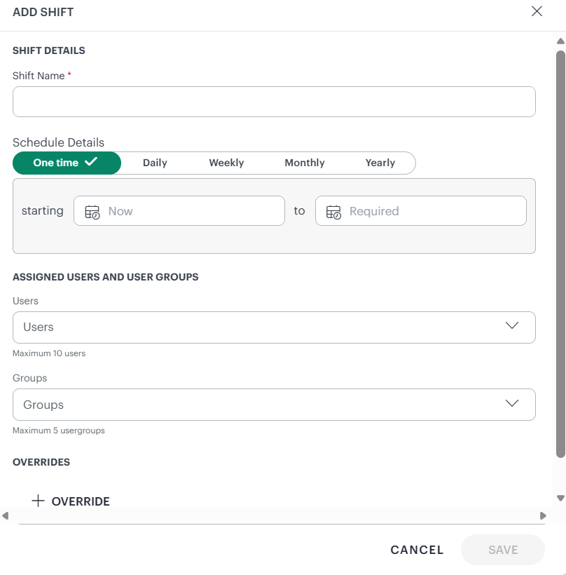 The Add Shift option allows you to define duty schedules within a roster, assign users or groups, and optionally create temporary overrides. To add a shift, click + Add from the Rosters page. The Add Shift panel opens with the following sections.